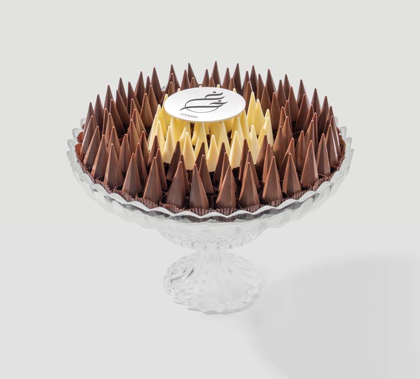 Pyramids Chocolate Tray, crafted in a circular harmony, with creamy Lotus and Raffaello fillings, offering a calm balance between texture and taste.