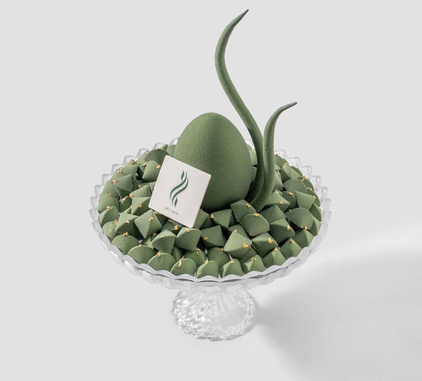 A focal chocolate tray with a balanced visual composition, centered by a piece made of center-piece chocolate and decorated with gold leaf. The chocolate colors and arrangement are executed according to the chosen theme, with various separate fillings including Madagascar vanilla, balanced coffee, and rich lotus, where each piece comes with one clear filling without any mixing.