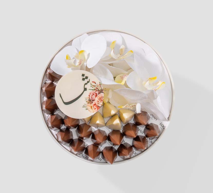 Pyramid Chocolate Tray crafted in a circular harmony, featuring creamy Lotus and Raffaello fillings that provide a calm balance between texture and taste.