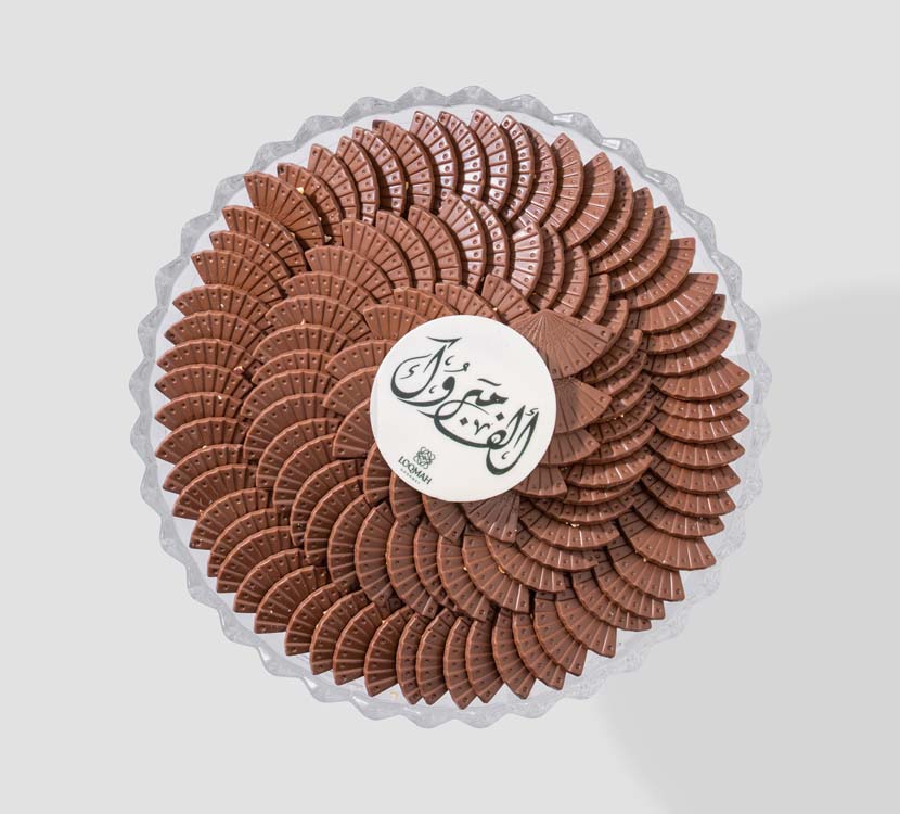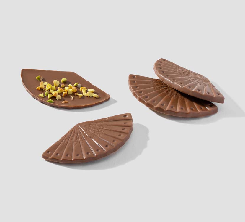 Pure Chocolate is designed with an elegant fan-shaped arrangement, topped with hand-roasted and fresh hazelnut pieces that add a luxurious taste and a distinct presence, completing the premium flavor of each piece.