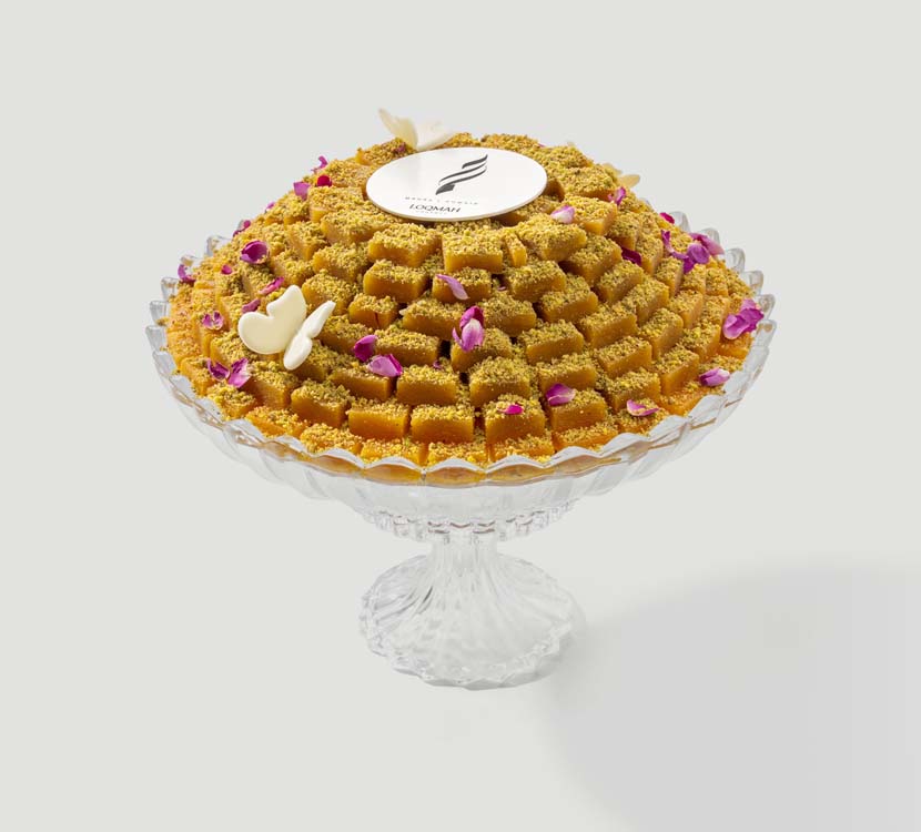 Luxurious Khabeesa inspired by the flavors of the Gulf, prepared with pistachio and cardamom and a delicate touch of saffron with a smooth texture and balanced flavor. Presented in an elegant crystal tray, suitable for high-end hospitality, family occasions, and special celebrations.