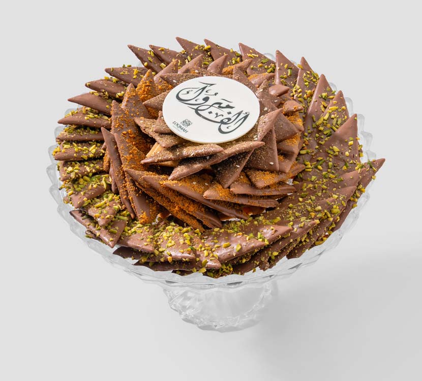 Sambousek made of crispy French crepe flakes (Feuilletine), coated with a smooth layer of Belgian chocolate. The tray brings together a selection of flavors: Za’atar, Lotus, and Pistachio, providing a clear variety in texture and taste. An elegant presentation focusing on fragility, crunch, and flavor.
