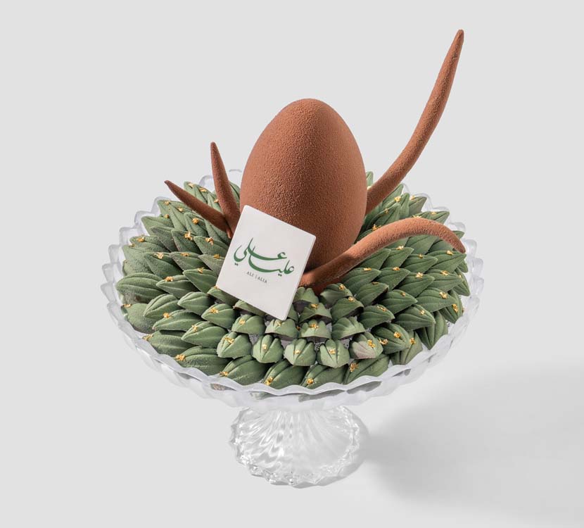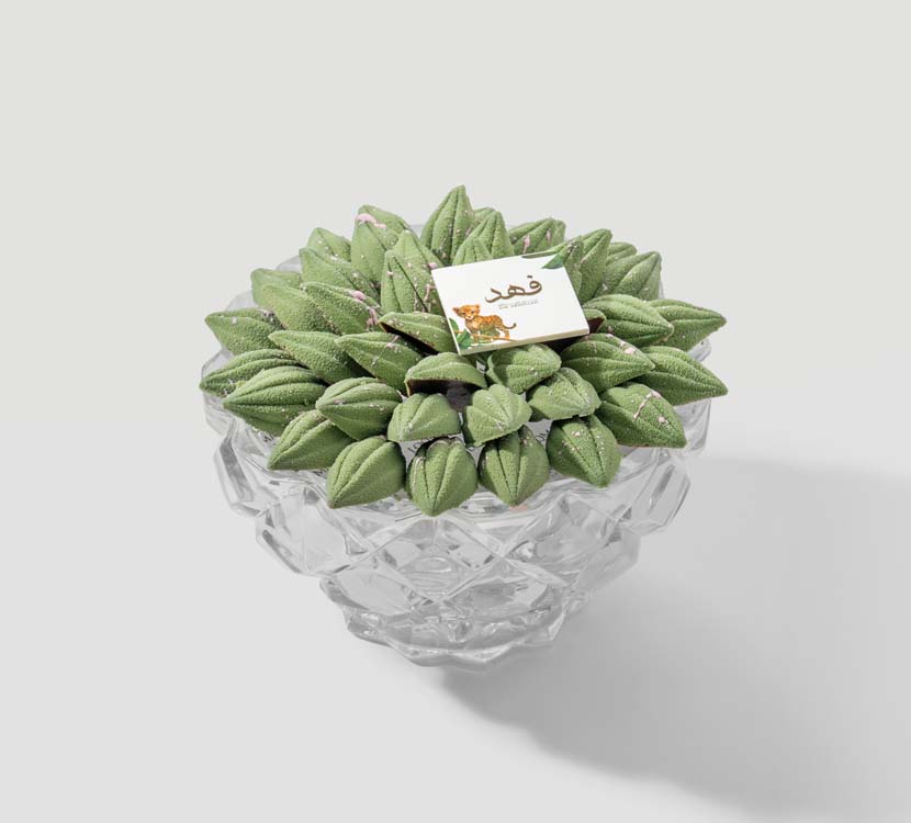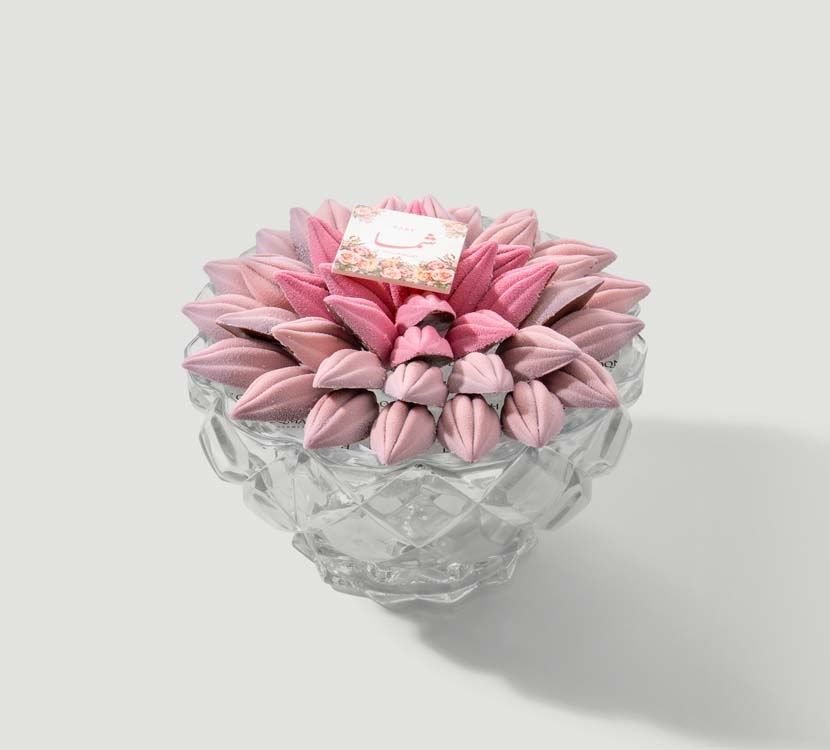 A chocolate tray with a sophisticated sculptural design, where chocolate pieces are carved in the shape of harmonious petals distributed smoothly around the composition. It is centered by a center-piece made entirely of chocolate, with fillings of smooth Italian caramel and rich hazelnut cream, providing a balanced variety of flavors without mixing. Chocolate colors and arrangement are executed according to your themes and choice.